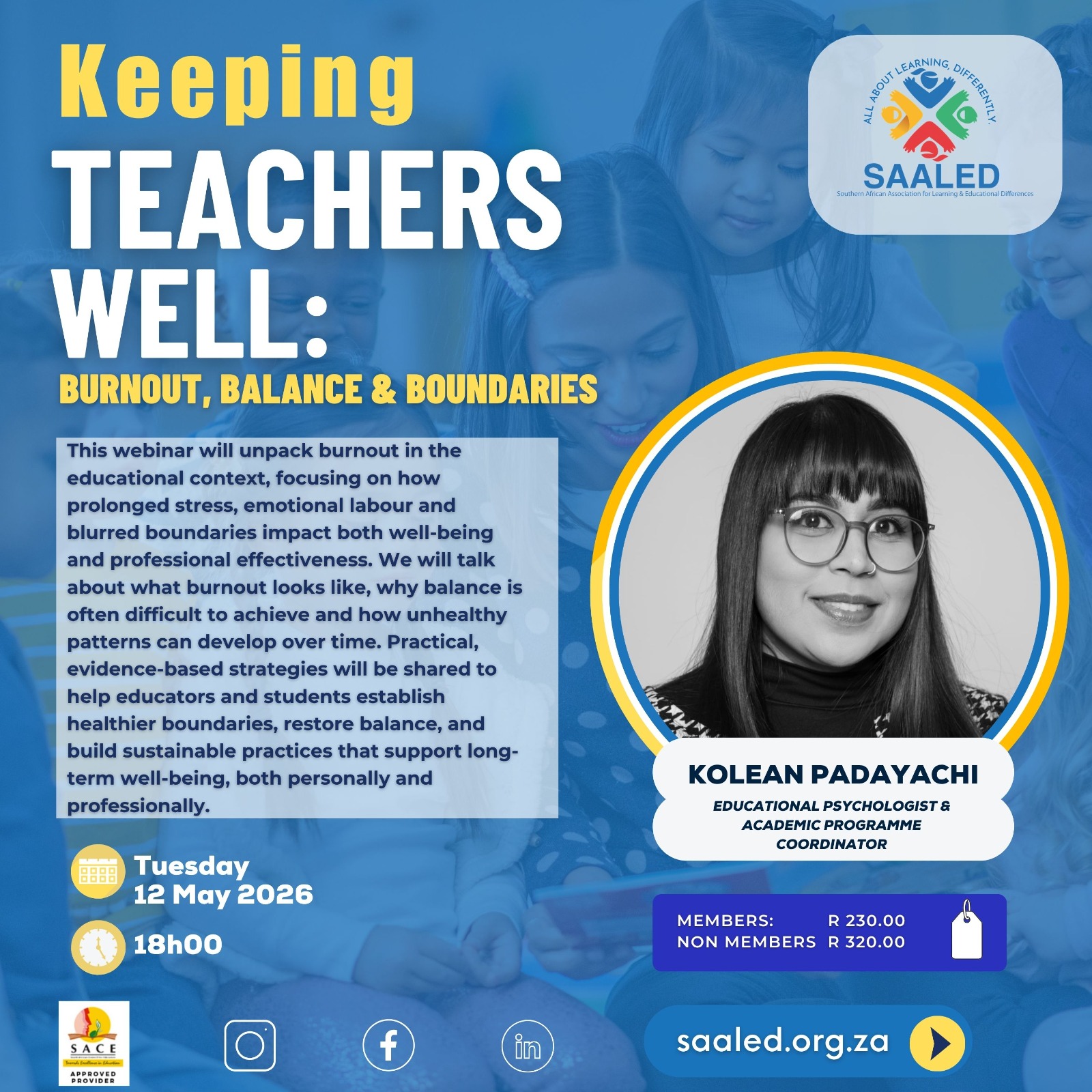 The webinar takes place on 12 May 2026 at 18h00 via MS Teams. The cost is R230 for SAALED members and R320 for non-members. School block bookings should be sent directly to events@saaled.org.za